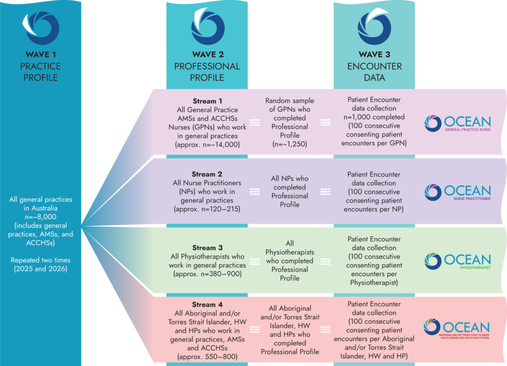 The Australian Government Department of Health, Disability and Ageing has contracted the study team to use OCEAN to collect and analyse data from targeted groups of health professionals working in Australian general practices, AMSs and ACCHSs.